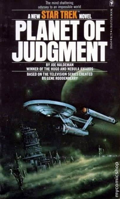 2) Planet of Judgement by Joe Haldeman. On a planet that seems to defy the very laws of physics, Kirk and some of his crew are stranded when their shuttles are grounded, and unresponsive. Their technology refuses to work, and there are vicious creatures in the jungle, including a plant which literally rips the face off a poor red shirt. They slowly learn that there is more going on here than they thought, and the strange telepathic inhabitants, need their help to stave off a galactic invasion.
