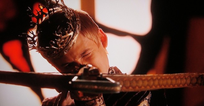 The boy king is angry over his defeat at Oxcross by Robb’s army, and has Sansa beaten in open court until Tyrion arrives, and saves her, openly defying the whiny king, and as he says, ‘educating’ him.