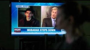 On-air, their own Elliot Hirsch (David Harbour) is broadcasting from Cairo about the apparent revolution going on there. But he can’t get out onto the streets, until Don (Thomas Sadoski) gives his ok, and he gets beaten with a rock.