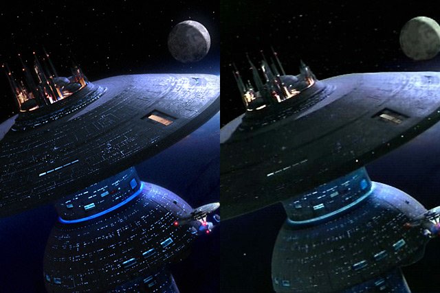 There are details in the costumes and sets I never noticed, and the colours for each are crisp and clear. You honestly wouldn’t believe that the first season was shot 25 years ago – the image is that impressive. (The upper image is the previous DVD image, beneath it is the blu-ray image.)