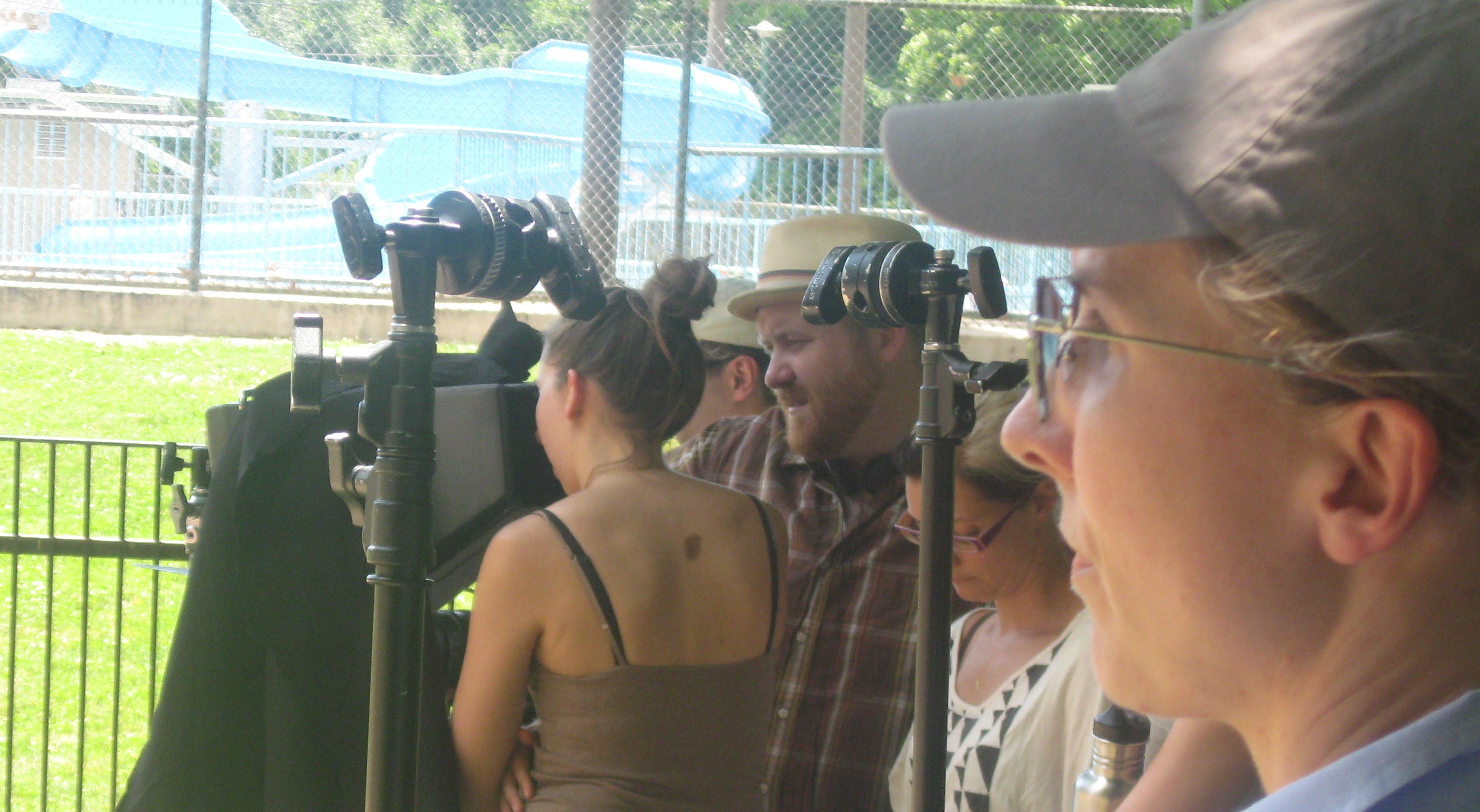 They shoot a medium and then a wide, the crew moving fast to move reflectors around, and work to keep the camera cool, sitting as it is in the hot sun.