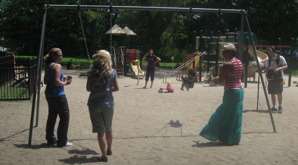 After a round of hugs, we all wander over to the next set-up, a swing-set which marks the first meeting, on-camera, of Mary’s Kate’s and Amanda’s characters.