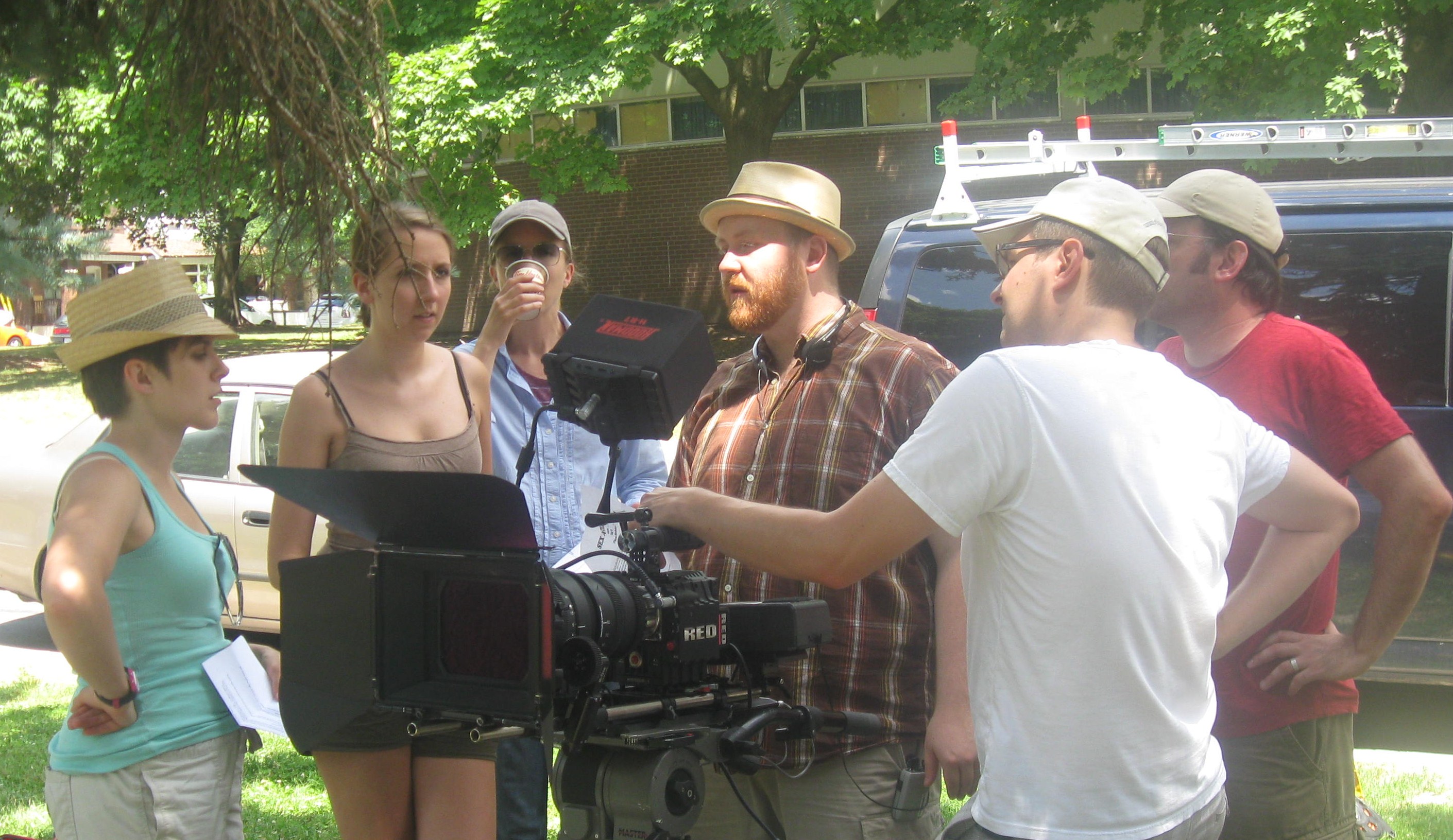 Jeremy is happy, and calls a wrap on the scene. A car arrives quickly to spirit Paul and Zoie away for a change of wardrobe as the crew races to change locations, racing the day, the light, and the quick turnaround of a costume change. Co-cinematographer and camera operator Zach Melnick lugs the Red Epic camera over to a bunch of benches, while Dennis Alexander Nicholson maneuvers his boom into a position that won’t show in the frame.