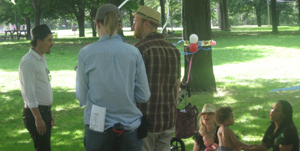 The sun is warm, dancing on the wealth of green leaves overhanging the park from the towering trees, light flickers back and forth as a breeze pushes the branches about and keeps things cool. Grey-furred squirrels chase one another around the trunks of trees, as people with dogs or children wander about the park.