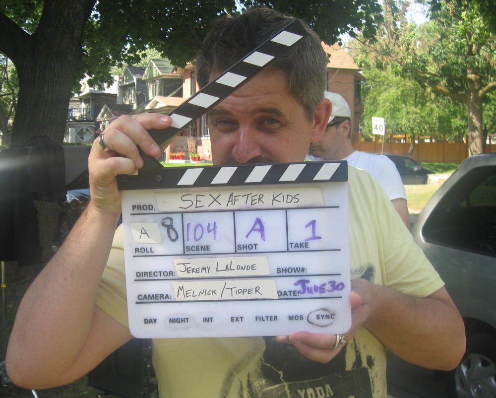 It’s mid-afternoon on the set of Sex After Kids and he’s watching an establishing shot of a party in the park. On the screen in front of him, Katie Boland tosses a rubber ball to some children, while Zoie Palmer and Paul Amos talk in the background, to the left of them, an attractive group of ladies, Mary Krohnert, Kate Hewlett and Amanda Brugel are chatting, and Kristin Booth wanders through the frame pushing a stroller.