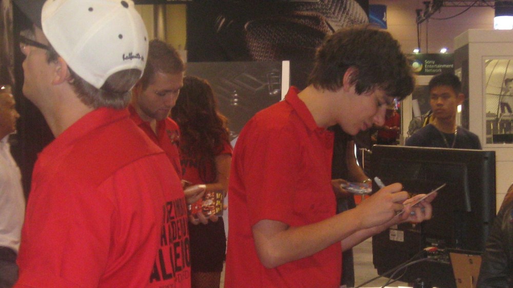 We jostle our way through crowds, chasing down interviews, including scoring one with our good friends Tim Doiron and April Mullen, along with the star of their new movie Dead Before Dawn 3D, Devon Bostick (Diary of a Wimpy Kid). This is Devon’s first convention, and he seems eager and excited for the day.