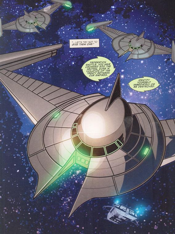 Issue 8 opens with Kirk, McCoy, their captured Romulan prisoner, a Lt. Zahra, and Mr. Hendorff (better known from the films as ‘Cupcake,’ in a shuttle craft racing towards Romulan space, the idea being to approach peacefully, rather than with the armed threat the Enterprise would present.
