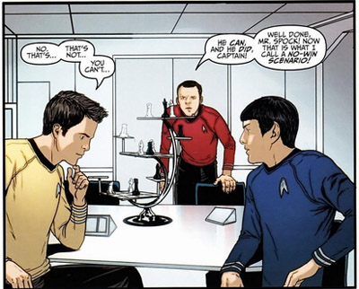 Kirk confers with Spock, and both realize it will take to long for a response from Starfleet, so they decide to pursue the ‘Romulans.’