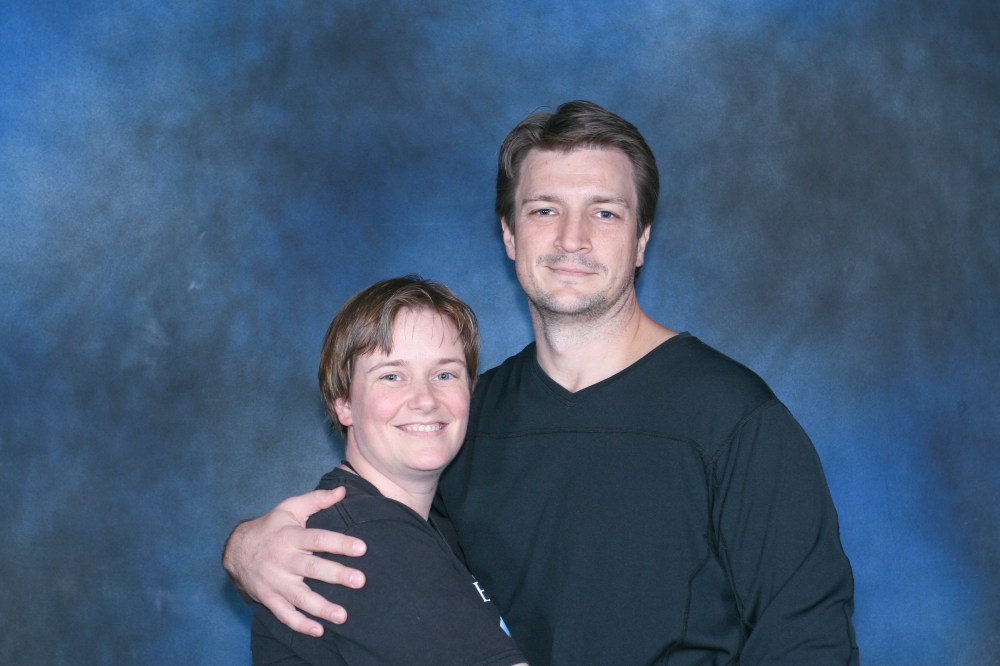 Adam Baldwin was every bit as friendly with me as he’d seemed to be with everyone all weekend long, and I left my first convention a very happy Sue, indeed.  What’s more, I got to work on Monday, and found that one of my co-workers was not only a huge Firefly fan,  but he was willing to burn me copies of his DVD’s so that I could watch the show and be all caught up before the film came out.  I took them home and watched one episode right after the other, every free moment I had.  I couldn’t even watch just one episode at a time…if I watched one, I had to finish the disc.  Firefly took hold of me from the start, and it never let go.  I loved the cast of characters, I loved the world in which they exist, and inside of myself, I found that I exist there, too.  That futuristic band of misfits  made me a part of their family – I sit with them at their table, I fly around in their spaceship with them, I worry for their safety, I laugh with them, cry with them, and love with them.  I bought my own set of DVD’s immediately, and it became my standard gift to everyone I could manage, including my mom and brother, with whom I’ve been especially delighted to share the ‘Verse and all it’s wrought.