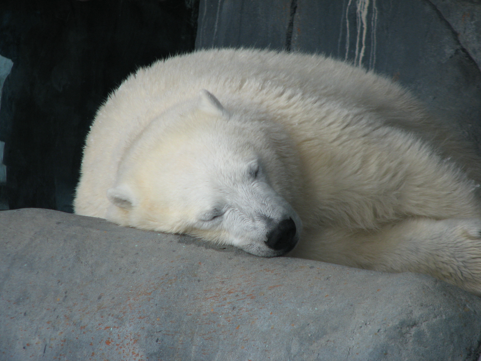 Eventually, it was time to go have our usual awesome lunch, and then head back to the Tundra to say goodbye Hudson. Walking up what I had come to think of as “Hudson’s Path” started making his imminent departure feel much more real, and a lump rose in my throat yet again. There weren’t many people up at the glass this time, and when we got up there, we saw why. Apparently, the lad had tuckered himself out putting on the Show of Shows for us all morning, and was now dozing peacefully over in a corner by the inside windows. Within moments of our arrival, his black eyes blinked open, looked right at us, then drooped closed again and he went back to sleep.