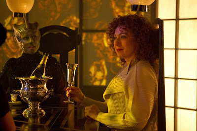 River Song (Alex Kingston), Strax (Dan Starkey), Vastra (Neve McIntosh), Jenny (Catrin Stewart) and Clara (Jenna-Louise Coleman) are holding a psychic conference call after Vastra encounters someone, a murderer, who has a message for the Doctor, about his grave and that he must go to Trenzalore.