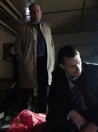 We open on a rainy day (haha back to rain right from the start!) inside a car, wipers squeaking across the windshield, as the car pulls up to a young girl. She appears to speak very briefly with the unseen driver before getting into the car. Next thing we know, Holder and his partner, Carl Reddick (Gregg Henry), are on the scene where that same girl’s dead body has been found. Holder’s in a suit and tie, so that’s new, and I was thrilled to see Gregg Henry at his side – is there anything that guy can’t do? Though, writing this, I’ve just realized that he doesn’t appear to be in any of the credits….not on the AMC page for the episode, not on IMDB. I wonder if that means he won’t be with us long? It would suck not to at least have him around for this one, but hopefully if he disappears from the show, it’s because Holder is working more officially with Linden as a partner, rather than because Reddick gets killed off early!