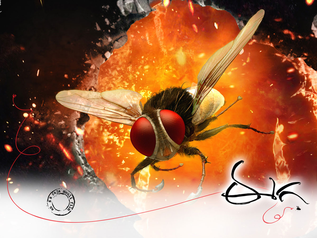 But as his soul is leaving his body, Nani has made two promises, one to always be there for Bindhu, and the other to kill Sudeep should he go near her. So he finds himself reincarnated as a fly and goes to town on Sudeep, making his life hell, while trying to find a way to kill him, something he tells the villain he plans to do in no uncertain terms which leads into an applause-filled scene, as well as an awesome intermission card.