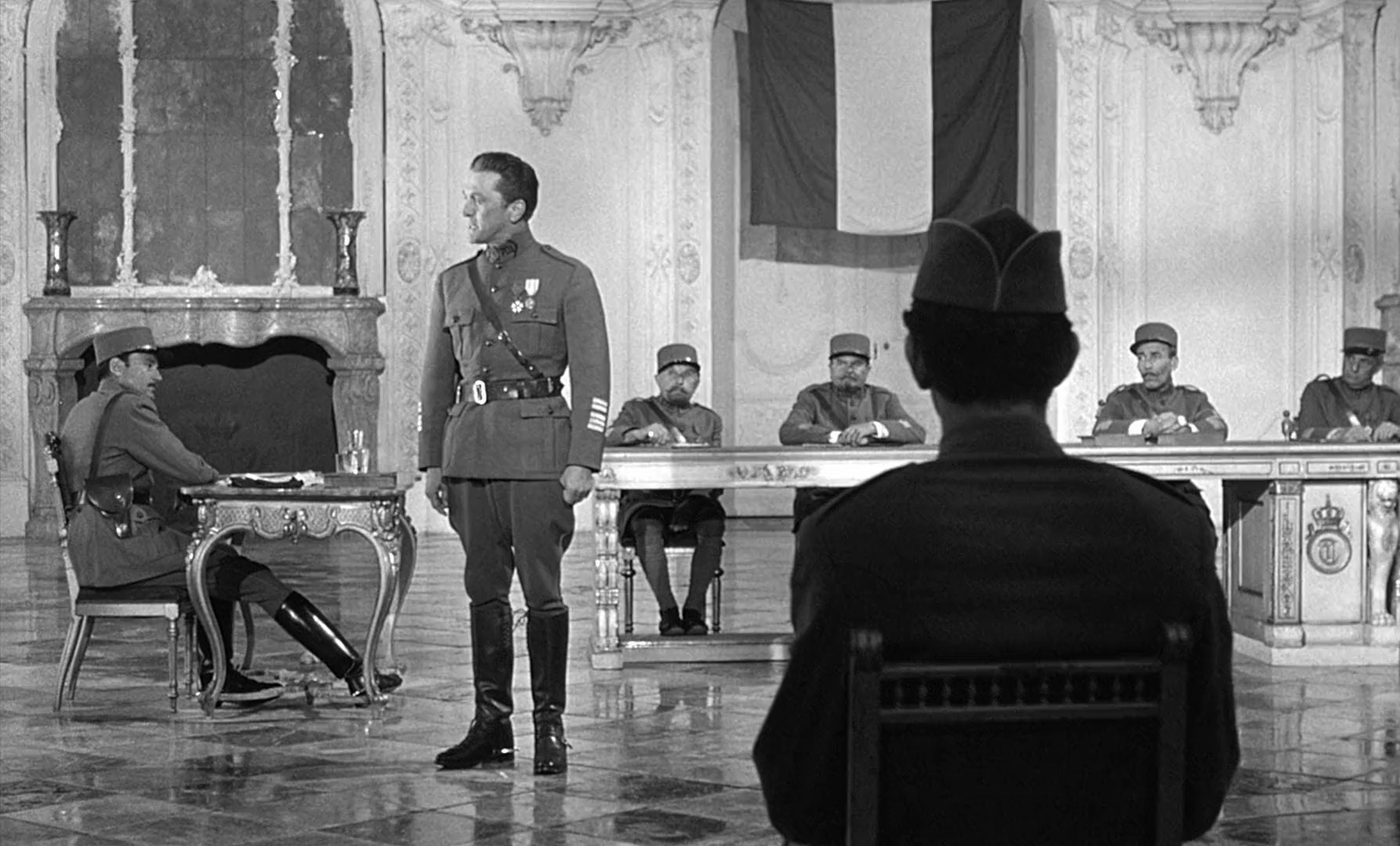 Mireau demands a court-martial for the 701st, for cowardice, in the failed assault. Dax goes so far as to offers himself up instead of the 100 men Mireau wants shot. The general ‘compromises’ and orders three men. one from each division in the first wave, to stand for the court-martial, the charge: cowardice in the face of the enemy, with Dax serving as their defense.