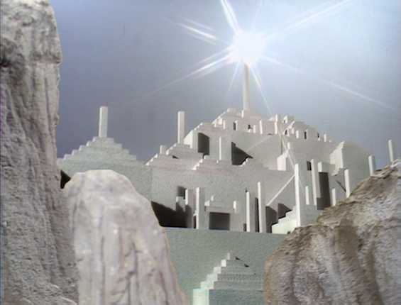 Amongst the tunnels the Doctor and Sarah-Jane encounter more Exillons, though these don’t share the same view as the surface dwellers, as well as some very dangerous roots to which, I assume, Doctor and Companion were meant to be sacrificed to. Instead the Doctor heads off with one of the aliens to investigate the white city, learning it is in face protected by a series of tests to measure intelligence so that only those who can understand it can enter it.