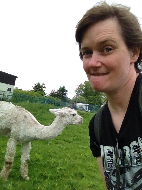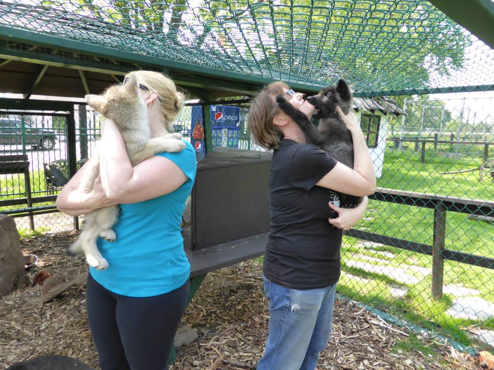 I managed to get a selfie with them, too, and then just sat down and enjoyed the cute furry whirlwind of adorableness! We played tug of war, our shoes were chewed on, Kristi’s hair, my sunglasses – one little girl even gave me a bit of an alien face-hugger experience! Belly rubs were given, toys were thrown and not brought back. It was a mututally exhausting and yet rejuvenating experience, I think! Those little girls were definitely the highlight, if only for their unbridled love and enthusiasm! It was very hard to leave them, but soon our time together was up, and it was time to roam the grounds a bit more before heading home. We stopped by the baby wolf enclosure to say goodbye before we left, and those wee girls were passed OUT with each other (and their stuffed toys), so we let them be, and went on our way.
