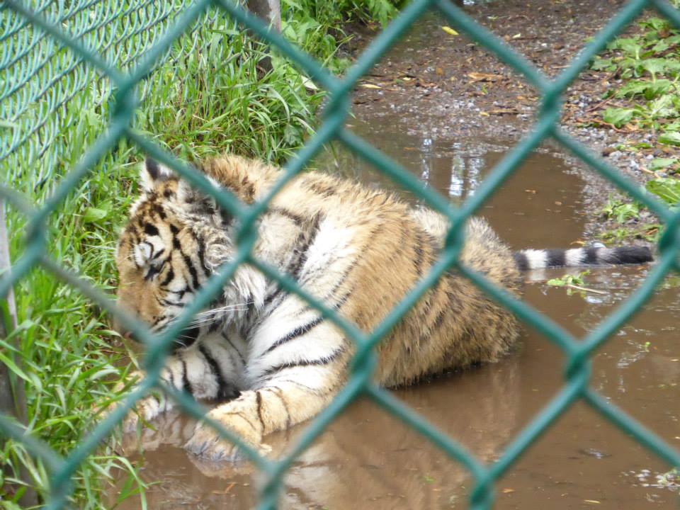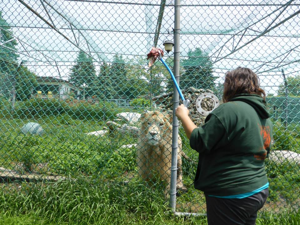 After we left Contessa (and she’d settled back in her enclosure by chilling out in a mud puddle, we wandered over to the area where the daily feeding tour was about to begin. There were peacocks and geese (some with goslings) wandering around, and much photo-taking commenced even before the main tour got underway! I love the feeding tour – I get to learn about each animal – as a species, and as an individual – and watch their various personalities shine when they are presented with food! I loved this one in particular, though, because the girl running the tour, Jen (hoping I at least got her name right), clearly loves her job, and the animals in her care, and the animals seem quite fond of her, as well. There’s nothing I love more than learning from someone who is passionate about what they do, and have the level of practical knowledge to back it up. From trying and failing to get the handsome white lion to stand on his hind legs, to sharing her amazed excitement when the male tiger (who lives with Nadine now – Raj?) actually washed his food in his water dish prior to eating it (!), speding that time with Jen was more fun and informative than I can possibly express! We took our time, too, pausing at each enclosure to take more photos and ask questions once the other visitors had moved on.