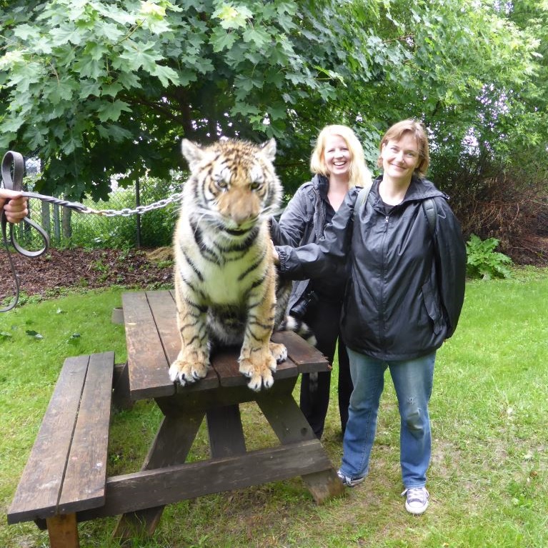 My first trip to Jungle Cat World was part of my 40th birthday celebrations, and at that time, my hopes had included having the experience of being able to pet a tiger. The specific tiger I’d hoped to meet was Nadine, but she was off-site that day, so even though I was disappointed, I still had the amazing experience of getting kisses from a beautiful arctic wolf named Vanda, feeding blueberries to some goofy young ring-tailed lemurs, and snuggling Tulip, a baby skunk.