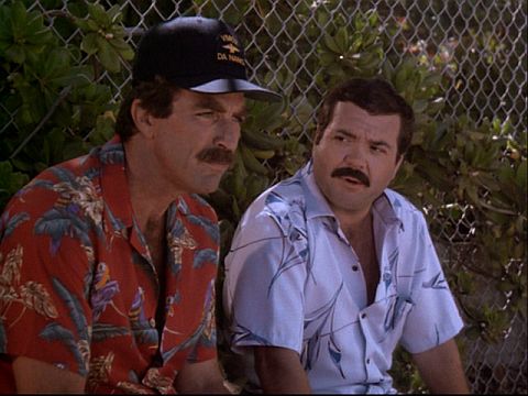 Wallowing in countless beers, he’s stunned when he sees someone who can’t be… Mac! Of course, Higgins (John Hillerman) doesn’t believe him, and has even consulted with Doc Ibold (Glenn Cannon) about committing Magnum to a hospital.