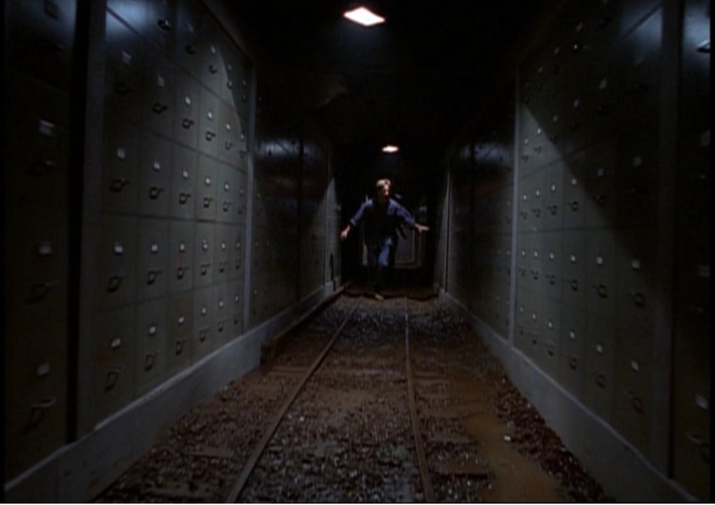 After a confrontation with the Well Manicured Man (John Neville) as well as a strange experience in a massive underground facility filled with endless filing cabinets (Mulder sees a UFO(?) and Scully catches a glimpse and encounters a group of child-size aliens (?)), containing information on what Mulder believes are abductees, including Scully, and his missing sister (though originally it was supposed to be his file).