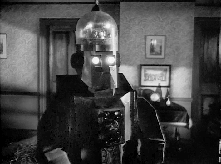 The delivery is in fact a robot, created by the Vampire, the first of a series apparently. And it is summoned back to its actual destination with Mother Riley in tow.