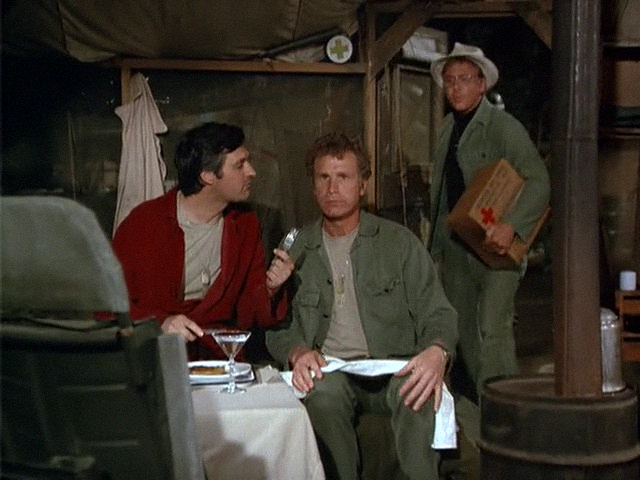 Trapper (Wayne Rogers) is writing a letter home to his kids (and occasionally smooching a nurse or two), Frank (Larry Linville) and Margaret (Loretta Swit) are temporarily on the outs over a matter of money, and Colonel Blake (McLean Stevenson) is feeling a little down over losing a patient.