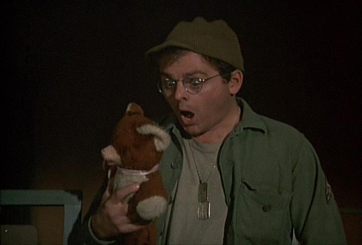 Radar wins, of course, and the end of the episode depicts him arriving back at the camp with a laundry list of charges, and Burghoff delivering a great depiction of the young corporal completely soused to Hawk and B.J.’s amusement, and Potter’s (Harry Morgan) incredulity.