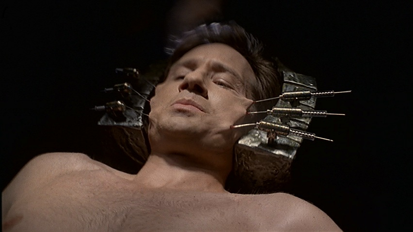As Gibson is safely tucked away into protective custody, we are given a glance of Mulder (is it another one of Scully’s nightmares?) trapped in a chair, being experimented on, surrounded by a number of the Bounty Hunters.