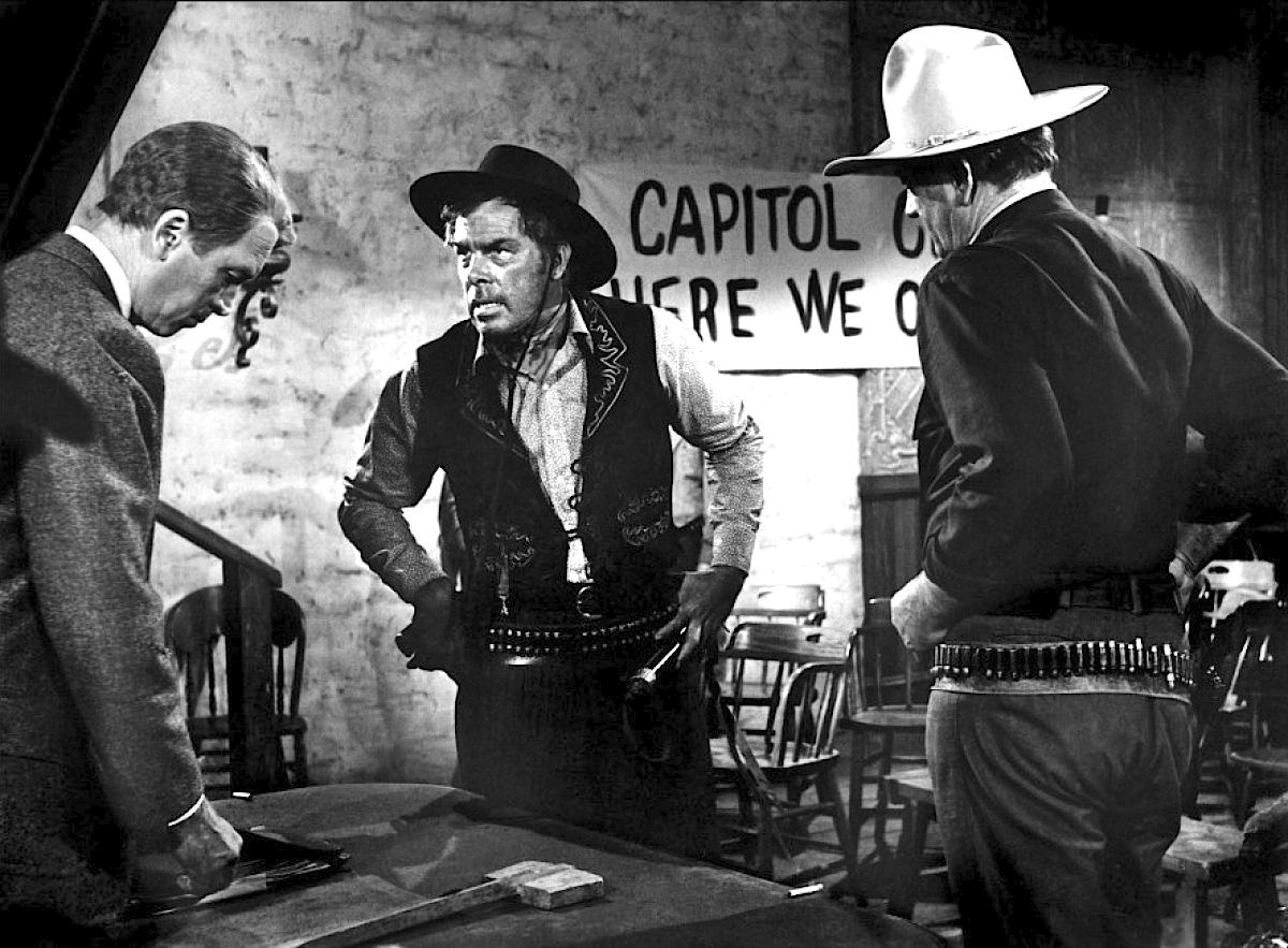 Ransom Stoddard (Stewart) is an attorney at law arriving in Shinbone a small town in one of the open territories, land owned by cattle ranchers. They are very much against Shinbone and the rest of the territory taking on statehood. Ransom has a reason now for his arrival. While there he revitalizes a lot of the town’s intellectual aspects, runs a school to teach reading and writing, and he gets Peabody (Edmond O’Brien), the local newspaper editor, to take pride in his work again.