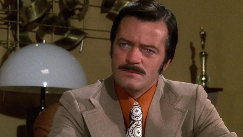 The targets are Joe Epic (Goulet) and Mike Apollo (Dewey Martin), but Joe is the one that they really go after. Joe’s wife, Leona, has died recently. Phelps plays an insurance agent playing the aspect that Joe murdered her. Casey (Lynda Day George) does some mask work, pretending to be a vision of Leona, haunting Joe and asking him to avenge her implying Apollo killed her after rejecting his seduction.