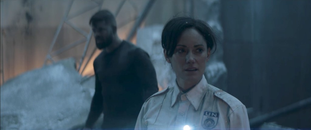 On Earth, Amos (Wes Chatham) is trying to find a way out of the Pit, the prison that is holding Clarissa Mao (Nadine Nicole). He won’t leave her behind, so along with another prisoner, and some prison guards (including Natalie Brown), they struggle to find a way out of the ruin.