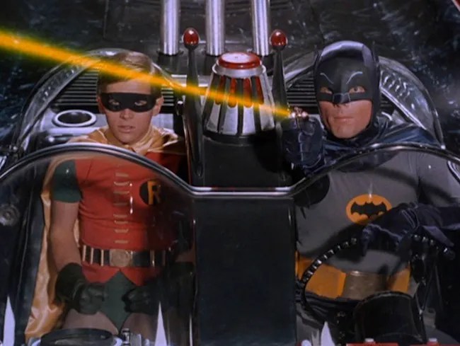When the Dynamic Duo foil the bank heist, we get our first real chase featuring the Batmobile and a number of gadgets are brought into play, apparently, there’s a bat-laser, and a Batmobile decoy! The chase is carried out through an old standing movie set of city streets, and old west buildings.