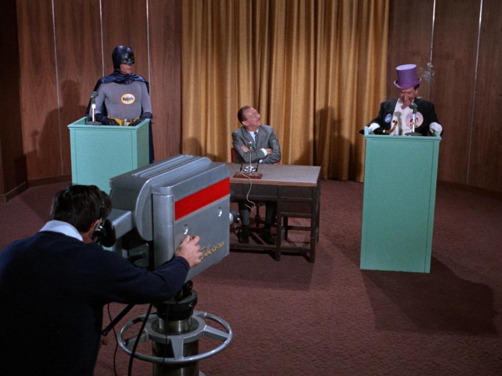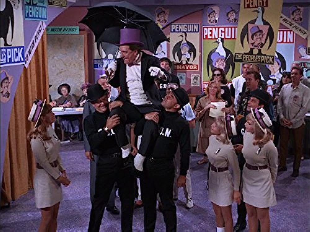 So The Penguin is back in Gotham City, and not only has he gone straight, he’s thrown his hat into the political arena to be mayor (Holy Shades of Batman Returns!). Commissioner Gordon (Neil Hamilton), Chief O’Hara (Stafford Repp) and the outgoing mayor, Linseed (Byron Keith) think there’s only one person who can run against Penguin and win, Batman (Adam West)!