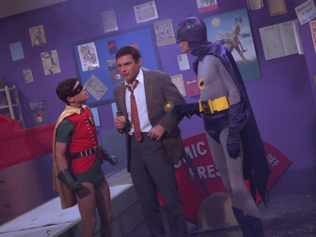 How does Robin get free? Through some help from Alfred (Alan Napier) who has accompanied Robin outfitted in a spare Batman costume!