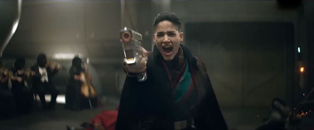 Ed Skrein returns as the villainous admiral, Atticus Noble who leads the attacking force on Veldt, and knows who Kora really is – she was used as a pawn in the assassination of the royal family and was young Princess Issa (Stella Grace Fitzgerald) killer.