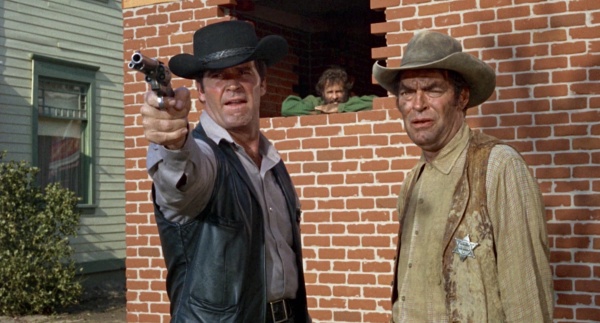 He’s barely in town for fifteen minutes when he’s already made an arrest for murder, and gotten himself a deputy. The murderer is Joe Danby (Bruce Dern) a cruel man who killed a man during a card game, and whose father, Pa Danby (Walter Brennan) is holding the town hostage by charging them access to the gold mine on the other side of the valley – he owns all the land between the town and the mine, they can either pay him 20% or he’ll rob the coaches of all of it.