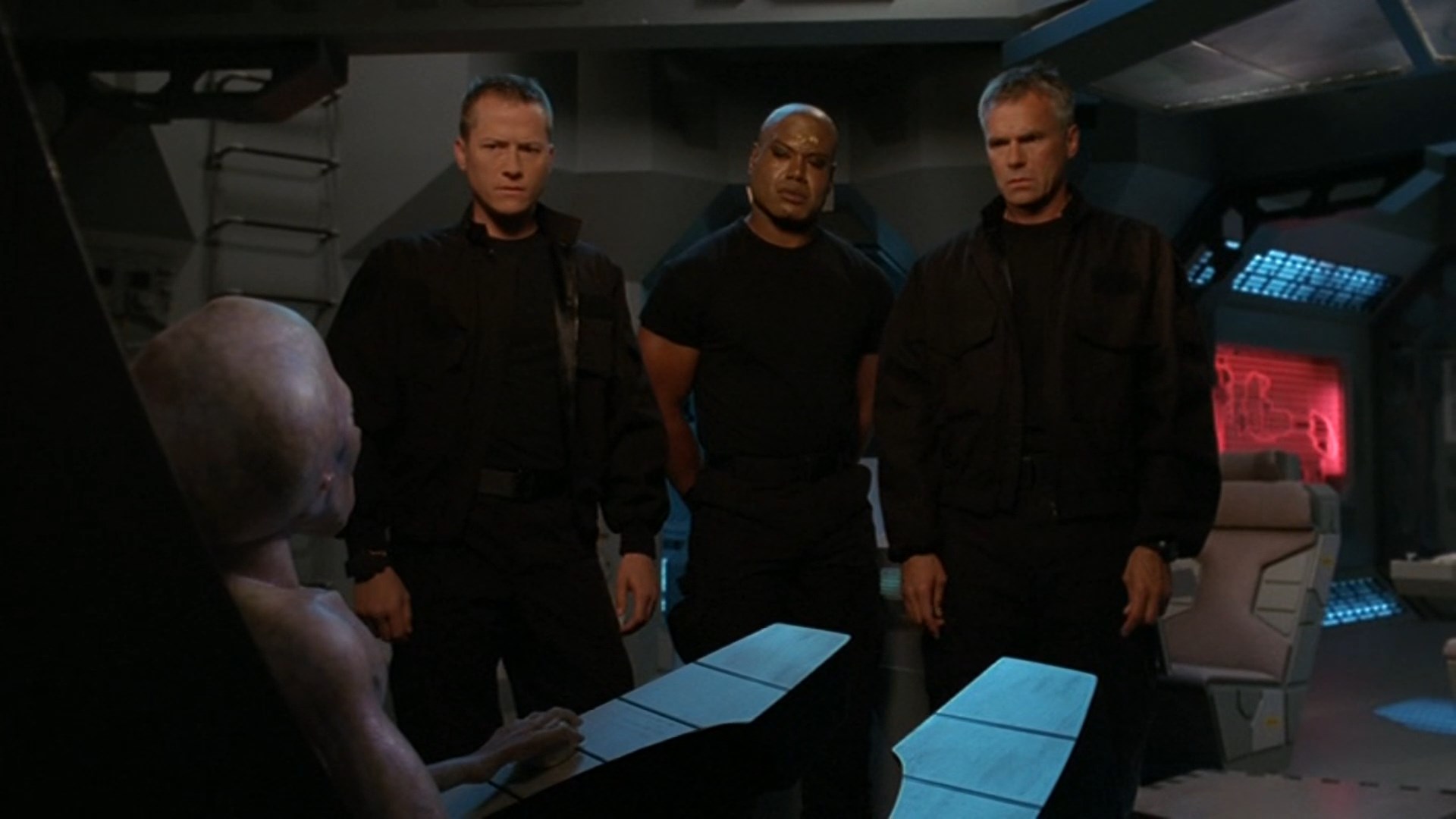 O’Neill, Davis and Teal’c (Christopher Judge) try to figure out a way to stop things on the outside, while Jonas Quinn and Carter attempt to delay things inside.
