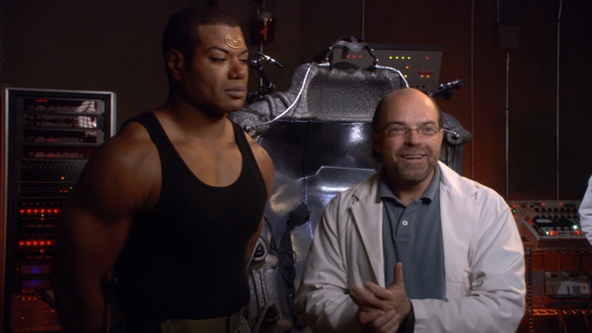 Dr. Lee (Bill Dow) has finished his work on VR training chair. Teal’c tests it out, and cites that it is too easily beaten. So he agrees to help Dr. Lee.