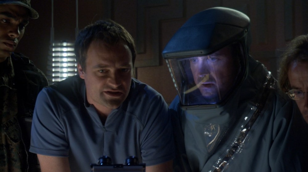 While McKay investigates, Sheppard (Joe Flanigan) and Teyla (Rachel Luttrell) are sequestered in a training room, and Weir (Torri Higginson) works to enforce the quarantine…. until someone goes on the run. And that causes a clash between Weir and Sheppard over who has command in the situation. And that’s going to be an issue. I hate that it happened, but I also like that it shows a problem arising between the characters.