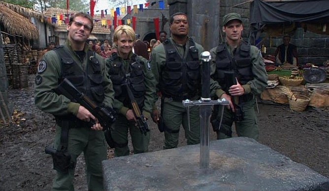 When they enter Merlin’s library, they trigger a defense system in the form of a Black Knight, who incites terror in the village. Can they find a solution, stop the Knight, and recover the weapon? Daniel and Mitchell work on that, while Teal’c goes to seek alliances, and Carter joins the Earth fleet.