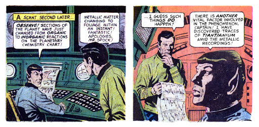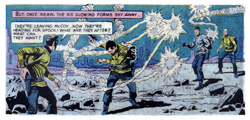 The beings reveal the history of their planet to Spock (who seems to have extra large pointy ears in this story). Spock understands, and works hard, muttering constantly, and leaving Kirk to worry about the health of his First Officer.