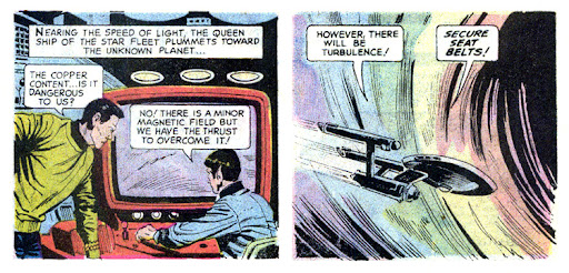The stardates for these missions continue to be problematic, and the Enterprise is still traversing whole galaxies instead of systems. But damn if I don’t dig some of the art. Sure the starship interiors are still a little crazy, but this Enterprise apparently has seat belts in addition to all the strange levers and consoles.
