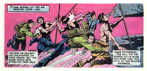 The Enterprise backtracks the laser to its point of origin, hiding from observation by using space debris as cover. Arriving on the planet’s surface, Kirk, Spock and McCoy find the denizens conducting target practice. Before they can be spotted, the landing party knocks them all out. Spock throws a helluva punch!