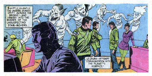 She lets something loose! At least four some things, that Giolitti draws to make look like ghostly monsters.The beings infiltrate the bridge, even as Spock attempts to locate the source of the beam on the planet.