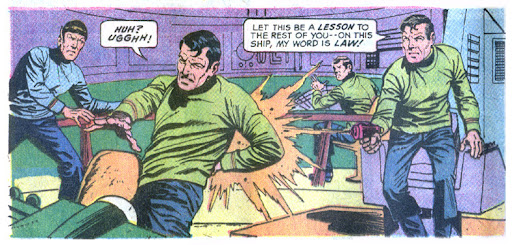 Spock and McCoy get together to talk about removing Kirk, and this is the first time in any of the comics that I could actually hear the dialogue. It feels and sounds very much like the characters.