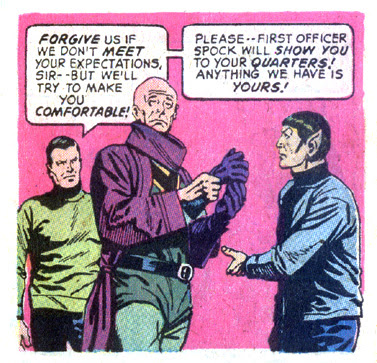 All honors are given the ambassador on his arrival; he’s piped aboard and Kirk and Spock even salute him. Unfortunately, the ambassador doesn’t seem the friendliest sort.