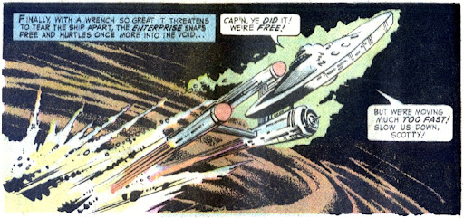 The Enterprise, which looks great in this panel, is moving to intercept a Klingon cruiser that has entered Federation space. Unfortunately, the Klingons are using a cloaking device which is making the ship difficult to track.