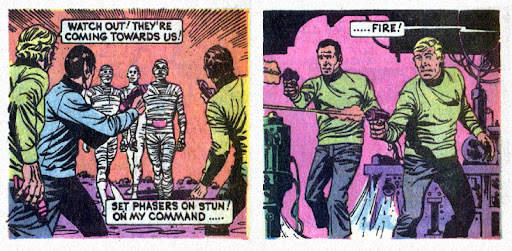 The issue opens with a silly splash page that shows Spock and McCoy firing their phasers at a group of approaching mummies. That being said, the first panel on the next page has a great looking rendering of the Enterprise.