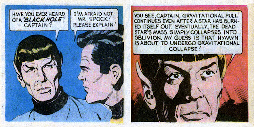 A nearby black hole is overloading the ship’s sensors with its quantum energy. Unbelievably, Kirk doesn’t know what a black hole is. I get that it’s done for the reader’s sake, but honestly, I don’t think you could be a Starfleet captain without knowing what a black hole was.
