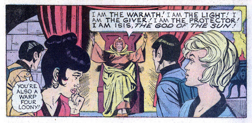 Beaming down to the the planet, the group finds themselves driven by a series of electrical bolts along a path that funnels them straight to a giant temple. They are welcomed inside by a strange being, an old woman, who knows who they are. She refers to herself as the sun-god incarnate, Isis. And she claims to have summoned them to her and that they wish to see her die. It’s easy to figure out that she’s the physical and intelligent representation of the dying sun. It takes the rest of the landing party a while to catch on to that thought.